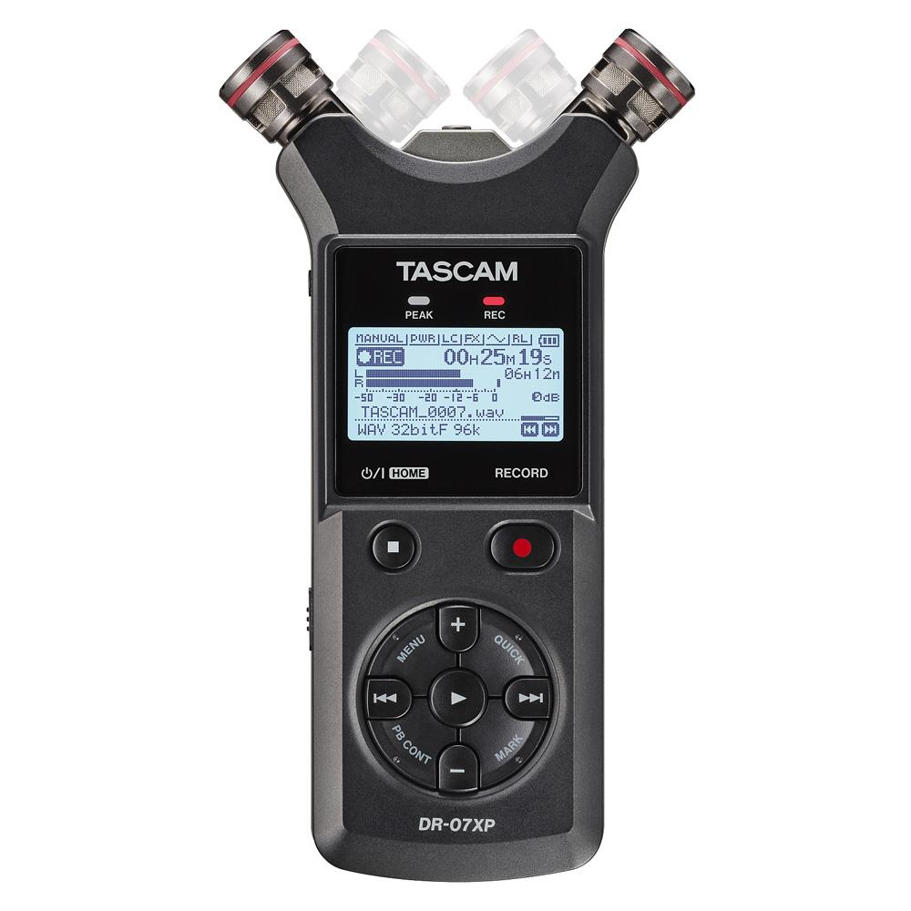 The DR-07XP is a portable stereo handheld audio recorder with built-in adjustable microphones and internal recording to microSD cards. It captures two-channel audio for music, video production, interviews and field recording.